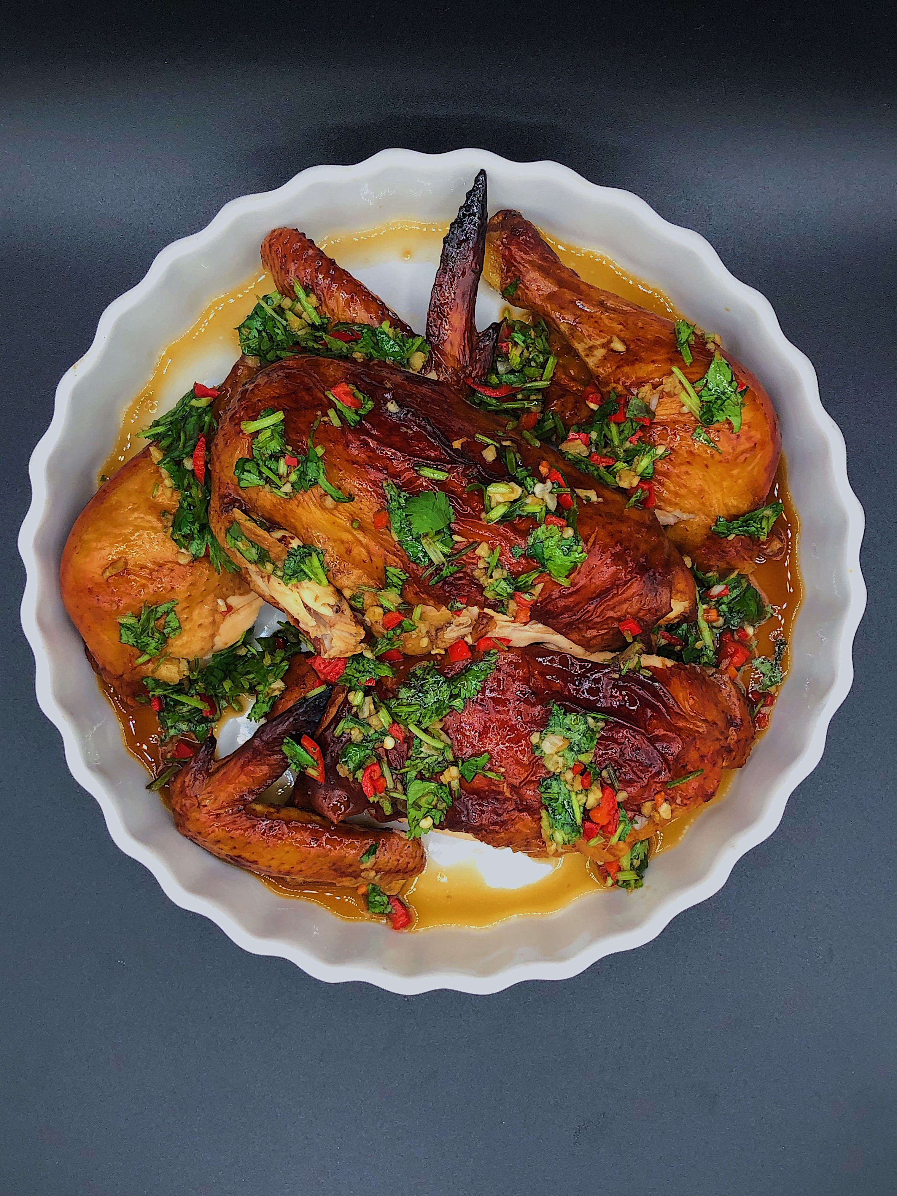 - Optional: Remove chicken from marinade and place on a lined baking dish. With a hair dryer set to hot, blow dry the chicken until the skin is dry and tight. We are attempting to recreate the process of hanging poultry in a breezy area (something many Chinese restaurants do) to dry out the skin to obtain an optimal crisp.
