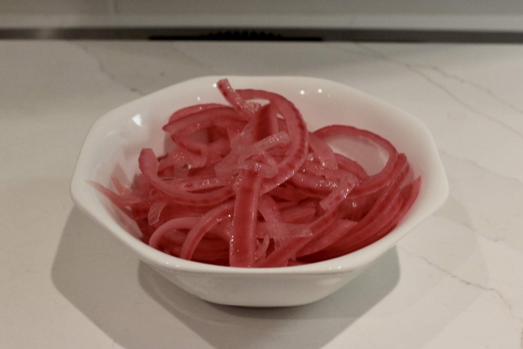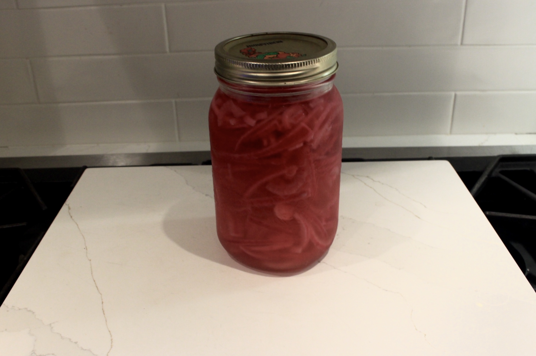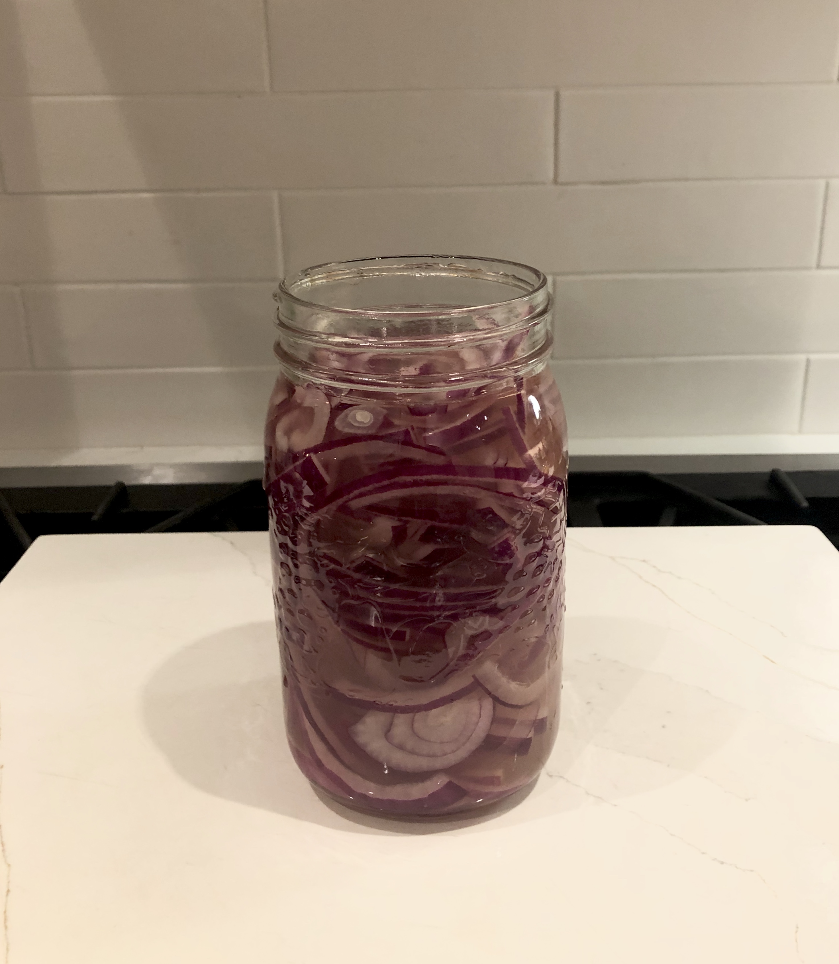 - In a mason jar add onions and pour over liquid. Let sit for 1 hour then seal jar and store overnight or for a few hours before serving