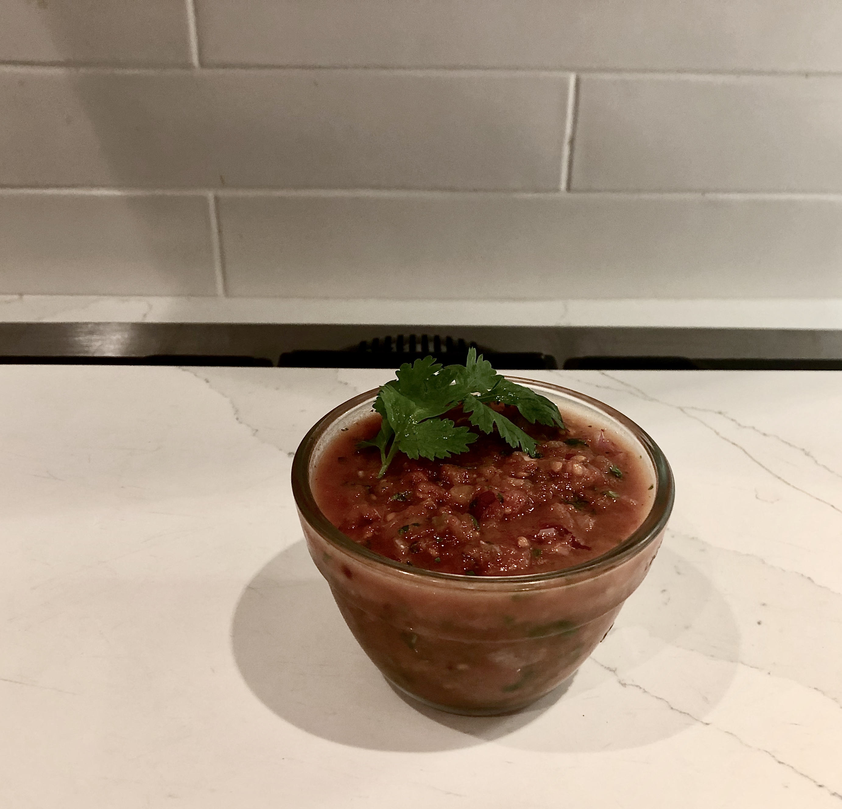 - In a blender or food processor add all of the ingredients and pulse until all of the ingredients are chopped and evenly mixed while still allowing the ingredients to be chunky.