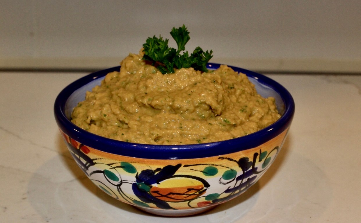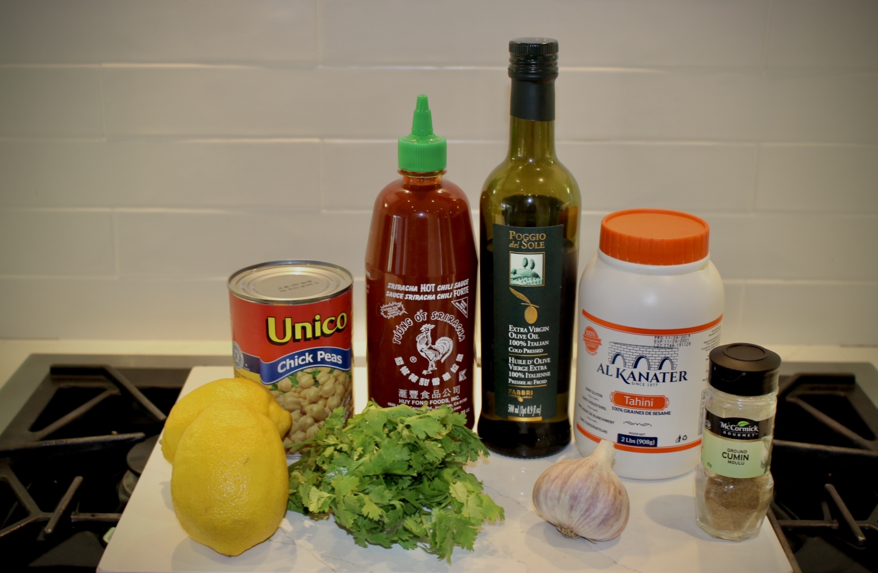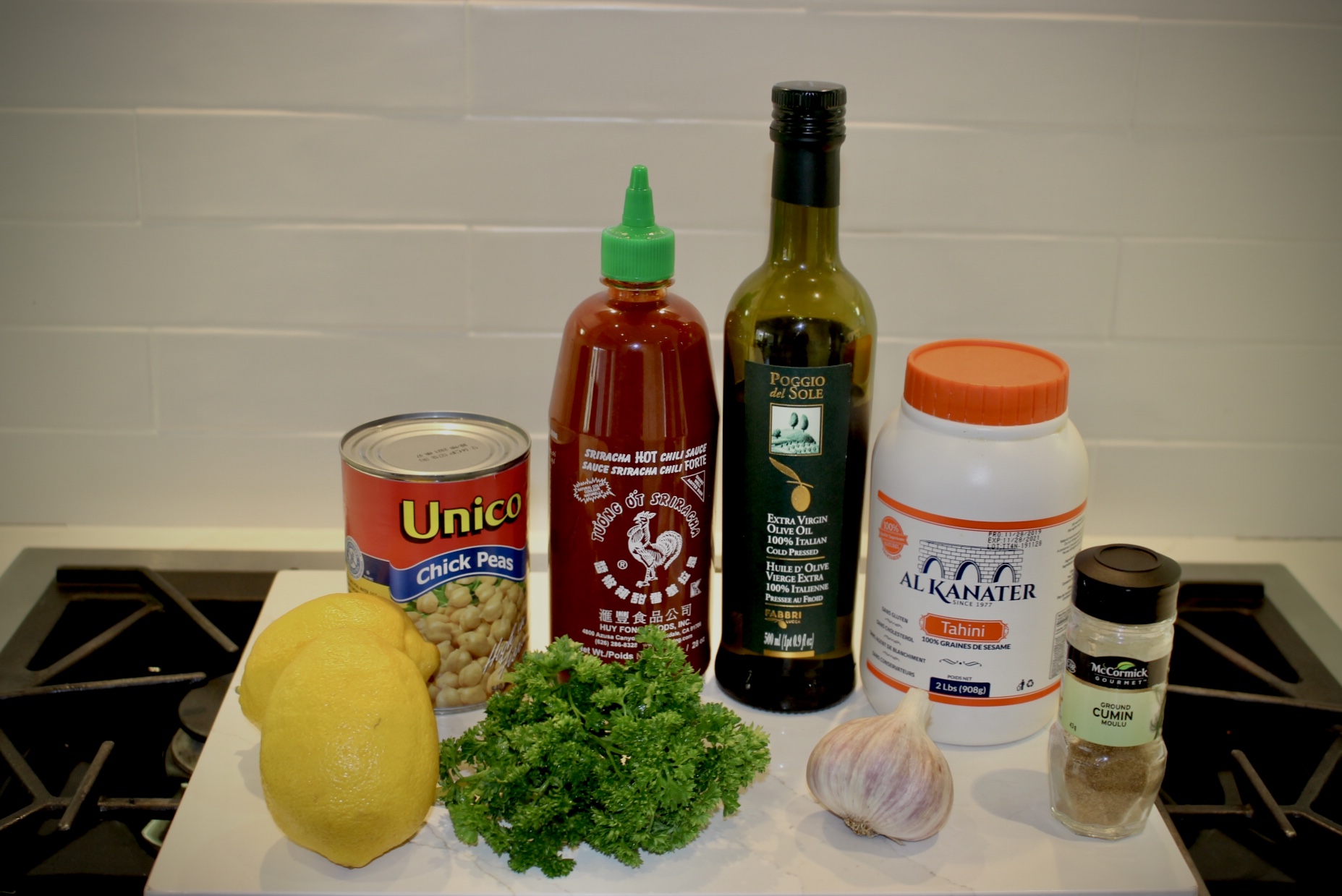 - In a large bowl add and mix the chickpeas, tahini, olive oil, lemon juice, cumin, garlic, hot sauce and fresh herbs.